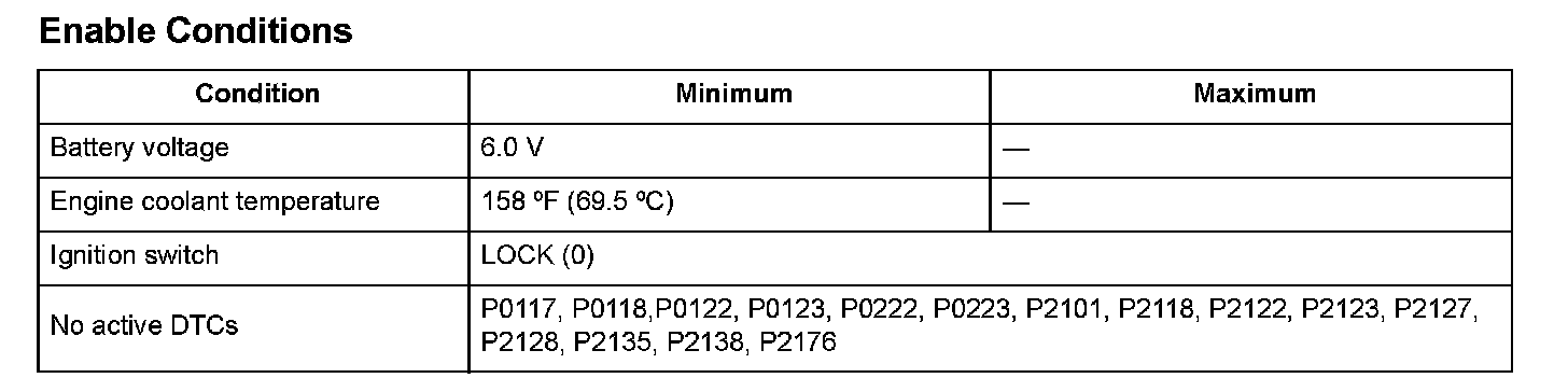 The throttle valve is at a position greater than +5° from the fully closed position, or at a position lower than +3° from the fully closed position, for at least 2.5 seconds.