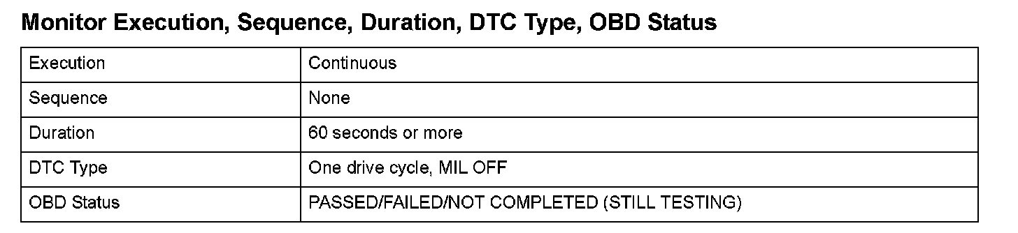 Monitor Execution, Sequence, Duration, DTC Type, OBD Status