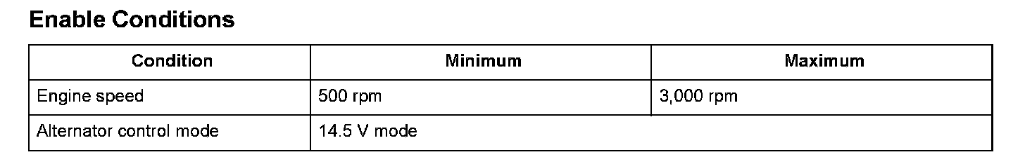 The alternator is driven by the engine, and it generates electricity to supply the necessary power to the electrical system and to charge the battery. The alternator voltage target values of 14.5 V and 12.5 V are achieved by switching the alternator control mode (controlled by the engine control module (ECM)/powertrain control module (PCM)). The alternator output signal is sent to the ECM/PCM, and it varies according to the battery's state of charge, the electrical load, and the engine speed. When the engine speed is a specified value and the IGP terminal voltage is below a set value when the alternator is in the 14.5 V mode, and the alternator power generation amount is within the set range, and this condition continues more than a set time, the ECM/PCM detects a malfunction and a DTC is stored.
