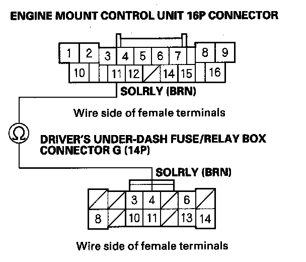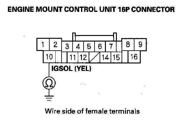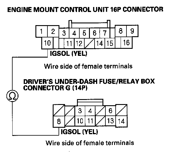 11. Check for continuity between engine mount control unit 16P connector terminal No. 11 and driver's under-dash fuse/relay box connector G (14P) terminal No. 4.