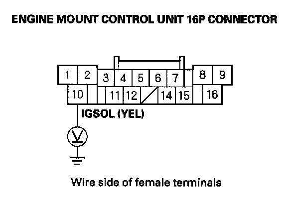 16. Measure the voltage between engine mount control unit 16P connector terminal No. 10 and body ground.