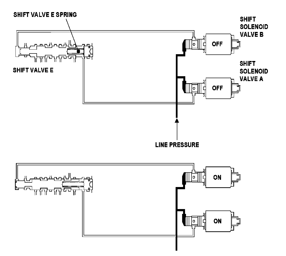 Shift valve E is incorporated in the control circuit of the transmission. It is controlled by pressure from shift solenoid valve B, and it is locked by the line pressure. It switches off when shift solenoid valve B turns off and shift solenoid valve A turns on. The PCM monitors the mainshaft speed and the countershaft speed and the gear change is determined by the shift schedule. When an improper gear ratio output is compared to the predetermined gear change mode, a shift valve E ON failure is detected and a DTC is stored.