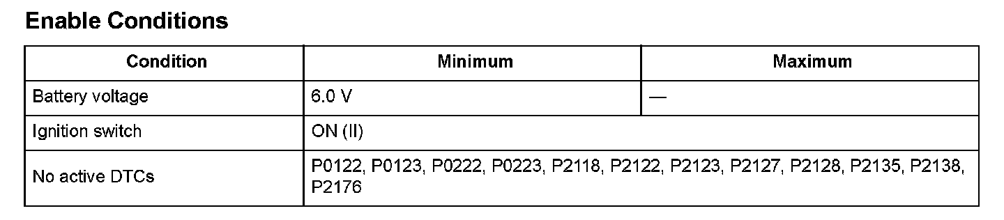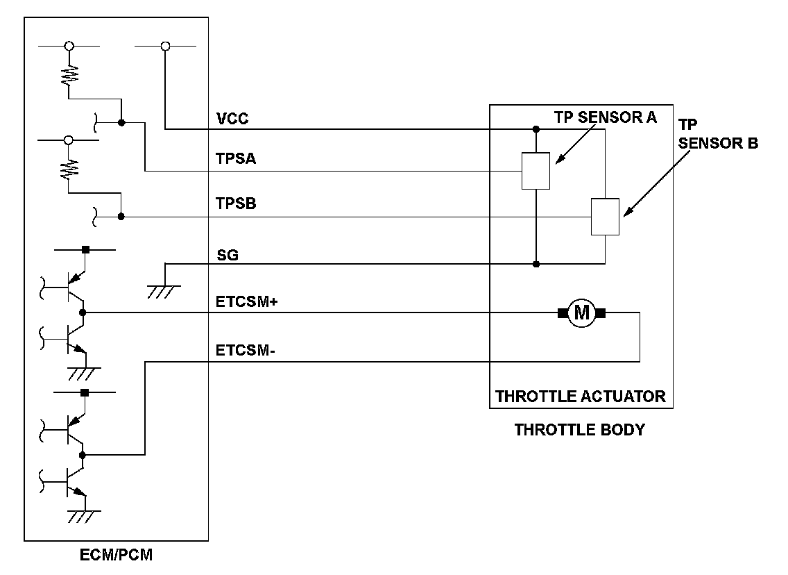The electronic throttle control system (ETCS) controls the throttle valve opening. The system is composed of the throttle actuator, the throttle valve, throttle position (TP) sensors A and B, the ETCS control relay, the accelerator pedal position (APP) sensor, and the engine control module (ECM)/powertrain control module (PCM). When the driver presses the accelerator pedal, the APP sensor reacts and detects the accelerator opening value. The accelerator pedal opening value is converted to a signal in the APP sensor and transmitted to the ECM/PCM to compute the target position.The ECM/PCM determines the throttle valve target position according to the signal received and operates the throttle actuator to move the throttle valve to the target position. The actual throttle valve position is determined by TP sensors A and B installed in the throttle body. The ECM/PCM compares the throttle valve target opening angle and the actual throttle valve opening angle from TP sensors A and B, and when the difference exceeds the specification, the ECM/PCM detects the malfunction of the throttle actuator system and a DTC is stored.