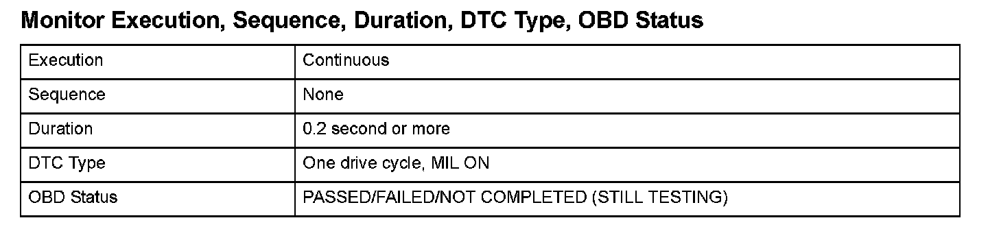 Monitor Execution, Sequence, Duration, DTC Type, OBD Status