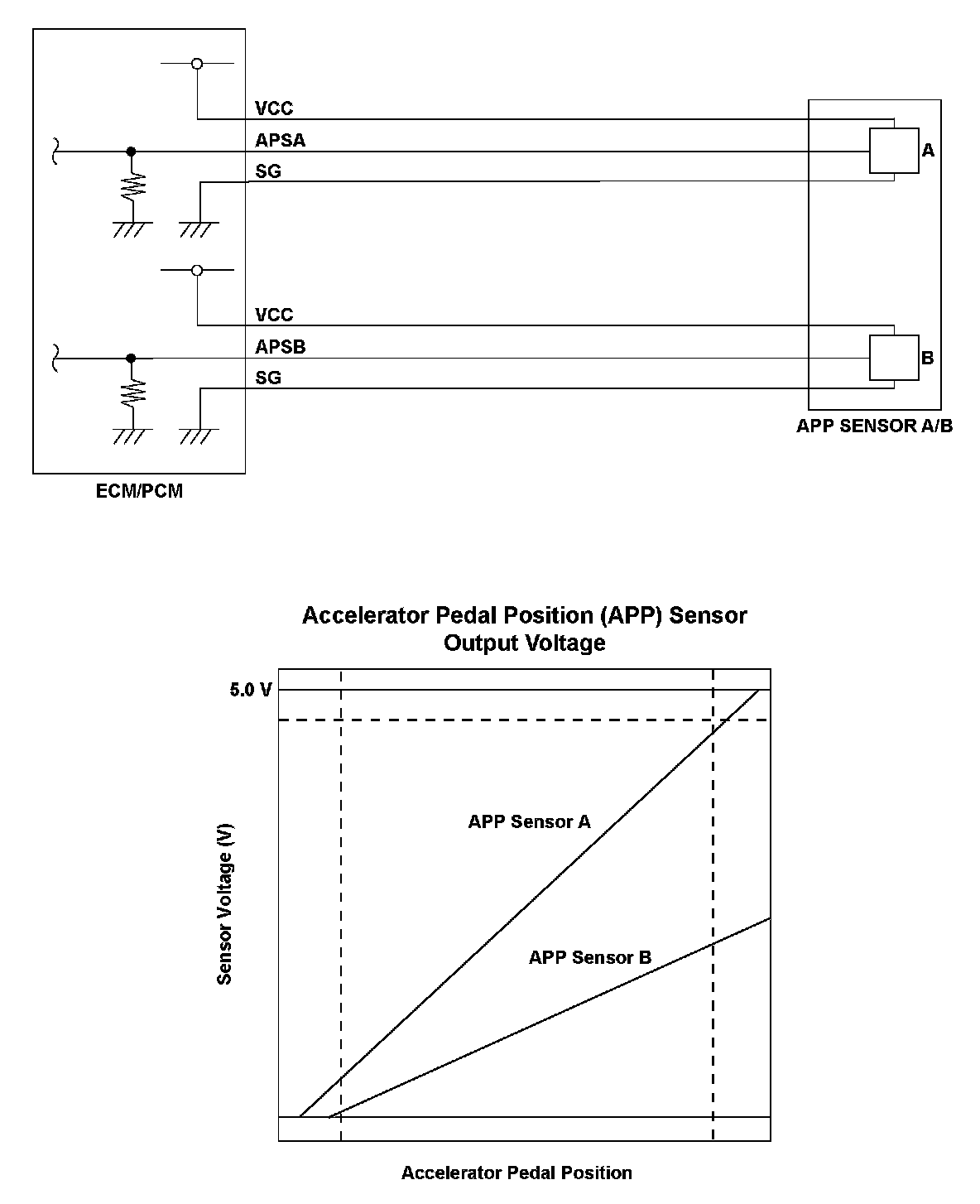 Accelerator pedal position (APP) sensor A and accelerator pedal position (APP) sensor B are potentiometers, and they are attached on the accelerator pedal. When the driver presses the accelerator pedal, the APP sensors A and B reacts and detects the accelerator opening value. The accelerator pedal opening value is converted to a signal in APP sensors A and B and transmitted to the engine control module (ECM)/powertrain control module (PCM) to compute the target position. The target position signal is then transmitted to the throttle actuator control module. APP sensor A is for the primary control, and APP sensor B is a back-up of APP sensor A in case it malfunctions. Both sensors compare their output voltage to each other for malfunction detection. When the voltage difference of APP sensor B is out of a fixed range for a set time, the ECM/PCM detects a malfunction, and a DTC is stored.