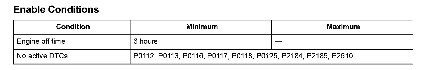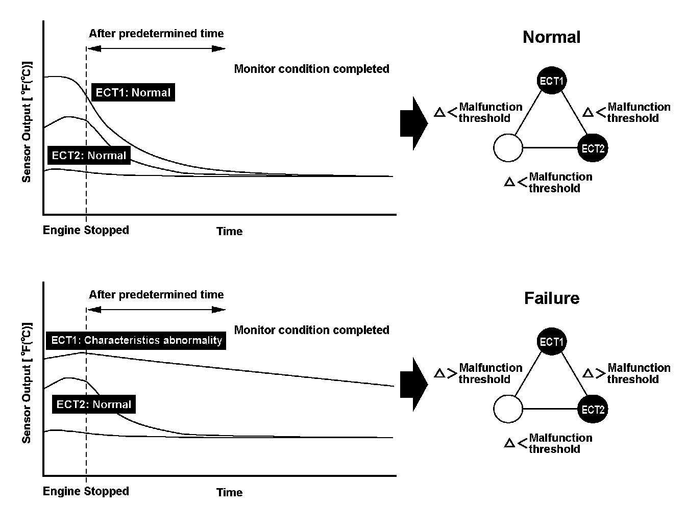 Two engine coolant temperature sensors and one intake air temperature sensor are used by the engine control module (ECM)/powertrain control module (PCM). When the engine is stopped and enough time has passed, the temperature of the engine will equalize to the ambient temperature. When an inappropriate temperature is detected after comparing the temperature readings of each sensor, a malfunction in the corresponding sensor is detected and a DTC is stored.