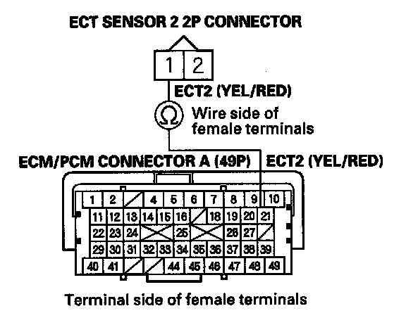 YES - Check for poor connections or loose terminals at ECT sensor 2 and the ECM/PCM, then go to step 1.