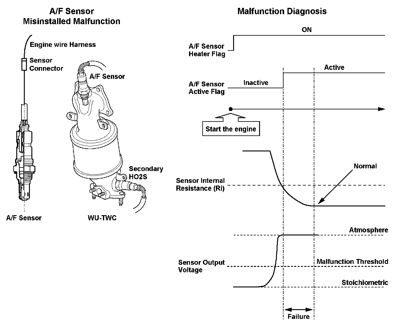 When the front air/fuel ratio (A/F) sensor (bank 2, sensor 1) is properly connected to the engine wire harness, but it is not installed in the exhaust pipe, the A/F feedback is not done properly even if the front A/F sensor is active after starting the engine. Thus, the exhaust emissions increase. When the front A/F sensor output stays out of the normal range after the front A/F sensor becomes active, the engine control module (ECM)/powertrain control module (PCM) detects that the front A/F sensor is not properly installed and a DTC is stored.