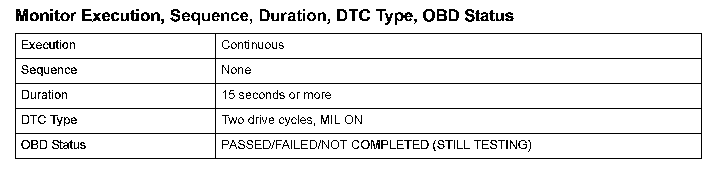 Monitor Execution, Sequence, Duration, DTC Type, OBD Status