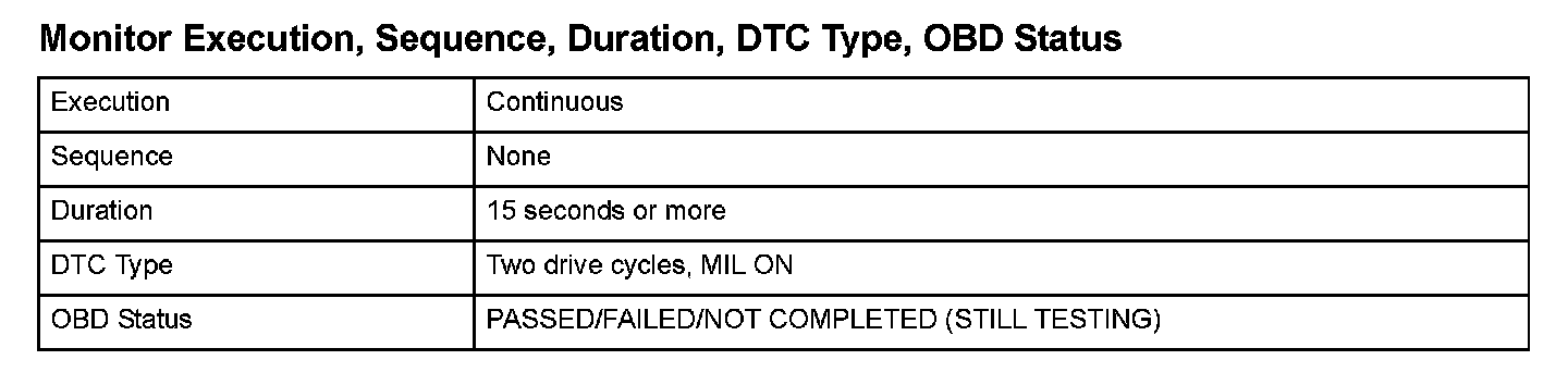 Monitor Execution, Sequence, Duration, DTC Type, OBD Status