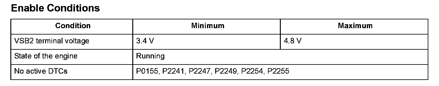 The front air/fuel ratio (A/F) sensor (bank 2, sensor 1) is installed in the exhaust manifold and detects oxygen content in the exhaust gas. The front A/F sensor transmits a signal to the engine control module (ECM)/powertrain control module (PCM). The ECM/PCM controls fuel injection duration by comparing the target air/fuel ratio with the front A/F sensor signal. The sensor includes the VS cell, the pump cell, the atmospheric reference cavity, the diffusion layer, and the heater, and it enables overall feedback control. If the IPB2 terminal voltage is out of a specified range, the ECM/PCM detects a malfunction and stores a DTC.