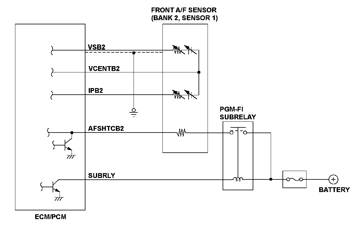 The front air/fuel ratio (A/F) sensor (bank 2, sensor 1) is installed in the exhaust manifold and detects oxygen content in the exhaust gas. The front A/F sensor transmits a signal to the engine control module (ECM)/powertrain control module (PCM). The ECM/PCM controls fuel injection duration by comparing the target air/fuel ratio with the front A/F sensor signal. The sensor includes the VS cell, the pump cell, the atmospheric reference cavity, the diffusion layer, and the heater, and it enables overall feedback control. When the self diagnosis function in the ECM/PCM detects a short failure, it measures the ECM/PCM input voltage of VSB2/VCENTB2/IPB2. If the IPB2 terminal voltage is less than VSB2/VCENTB2 terminal voltage, a malfunction is detected and stores a DTC.