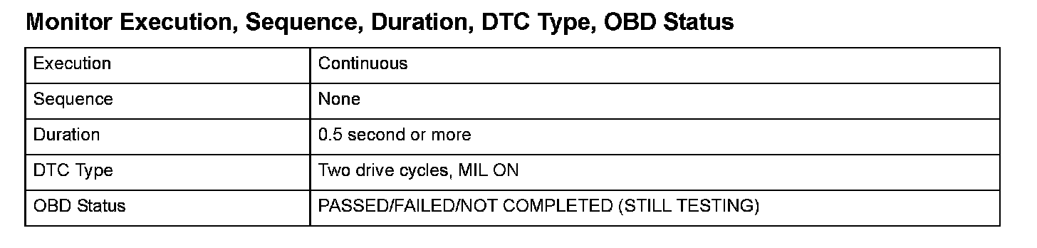 Monitor Execution, Sequence, Duration, DTC Type, OBD Status