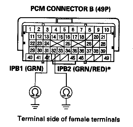 9. Check for continuity between PCM connector terminal B31 (B32)* and body ground.