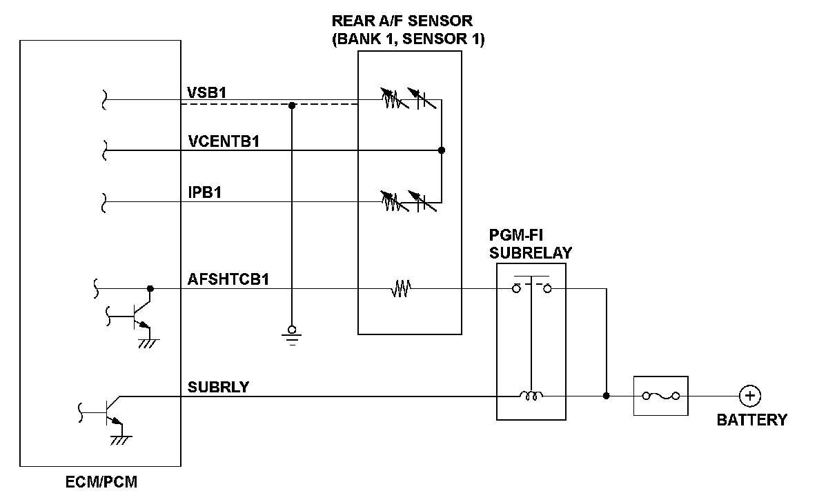 The rear air/fuel ratio (A/F) sensor (bank 1, sensor 1) is installed in the exhaust manifold and detects oxygen content in the exhaust gas. The rear A/F sensor transmits output voltage to the engine control module (ECM)/powertrain control module (PCM). The ECM/PCM controls fuel injection duration by comparing the target air/fuel ratio with the rear A/F sensor signal. The sensor includes the VS cell, the pump cell, the atmospheric reference cavity, the diffusion layer, and the heater, and it enables overall feedback control. If the VSB1 terminal voltage is a specified value or less for a set time, the ECM/PCM detects a malfunction and a DTC is stored.