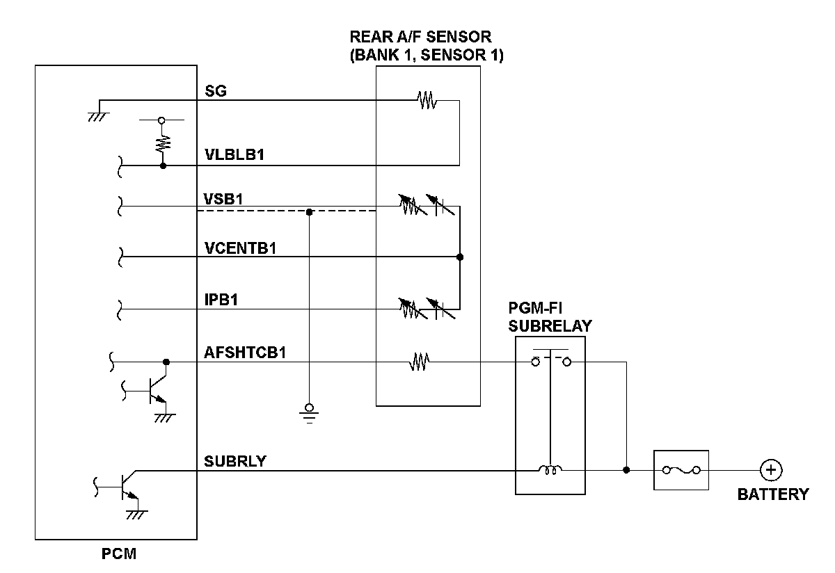 The rear air/fuel ratio (A/F) sensor (bank 1, sensor 1) is installed in the exhaust manifold and detects oxygen content in the exhaust gas. The rear A/F sensor transmits output voltage to the powertrain control module (PCM). The PCM controls fuel injection duration by comparing the target air/fuel ratio with the rear A/F sensor signal. The sensor includes the VS cell, the pump cell, the atmospheric reference cavity, the diffusion layer, and the heater, and it enables overall feedback control. If the VSB1 terminal voltage is a specified value or less for a set time, the PCM detects a malfunction and a DTC is stored.