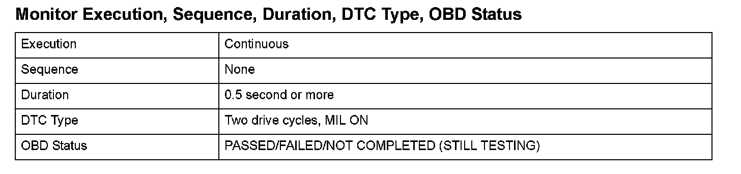Monitor Execution, Sequence, Duration, DTC Type, OBD Status