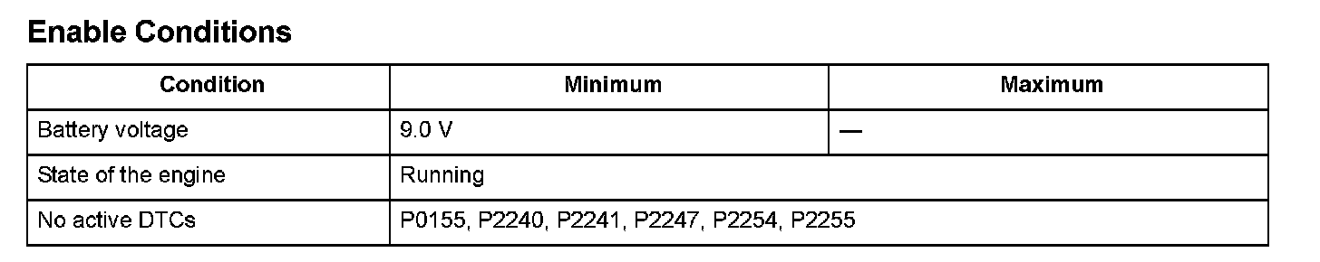 The front air/fuel ratio (A/F) sensor (bank 2, sensor 1) is installed in the exhaust manifold and detects oxygen content in the exhaust gas. The front A/F sensor transmits a signal to the engine control module (ECM)/powertrain control module (PCM). The ECM/PCM controls fuel injection duration by comparing the target air/fuel ratio with the front A/F sensor signal. The sensor includes the VS cell, the pump cell, the atmospheric reference cavity, the diffusion layer, and the heater, and it enables overall feedback control. When the self diagnosis function in the ECM/PCM detects a short failure, it measures the ECM/PCM input voltage of VSB2/VCENTB2/IPB2. If the VCENTB2 terminal voltage is less than VSB2/IPB2 terminal voltage, a malfunction is detected and stores a DTC.