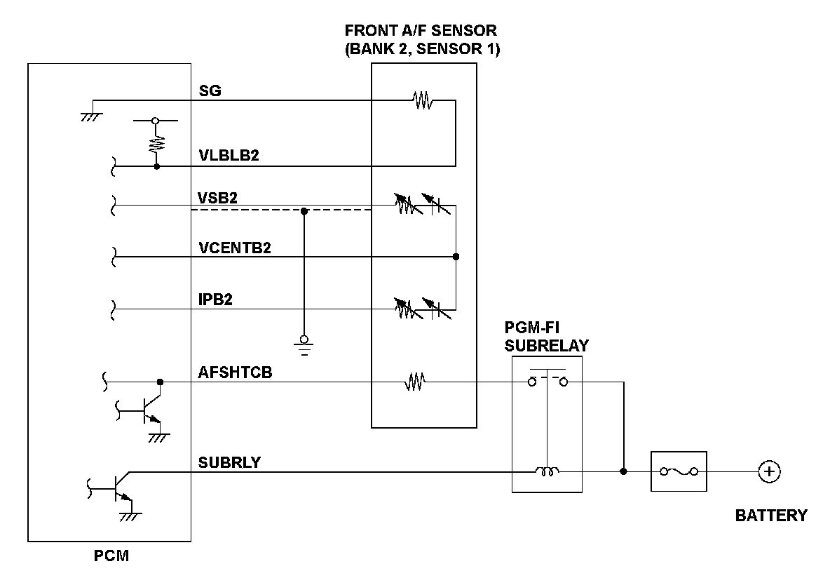 The front air/fuel ratio (A/F) sensor (bank 2, sensor 1) is installed in the exhaust manifold and detects oxygen content in the exhaust gas. The front A/F sensor transmits a signal to the powertrain control module (PCM). The PCM controls fuel injection duration by comparing the target air/fuel ratio with the front A/F sensor signal. The sensor includes the VS cell, the pump cell, the atmospheric reference cavity, the diffusion layer, and the heater, and it enables overall feedback control. When the self diagnosis function in the PCM detects a short failure, it measures the PCM input voltage of VSB2/VCENTB2/IPB2. If the VCENTB2 terminal voltage is less than VSB2/IPB2 terminal voltage, a malfunction is detected and stores a DTC.