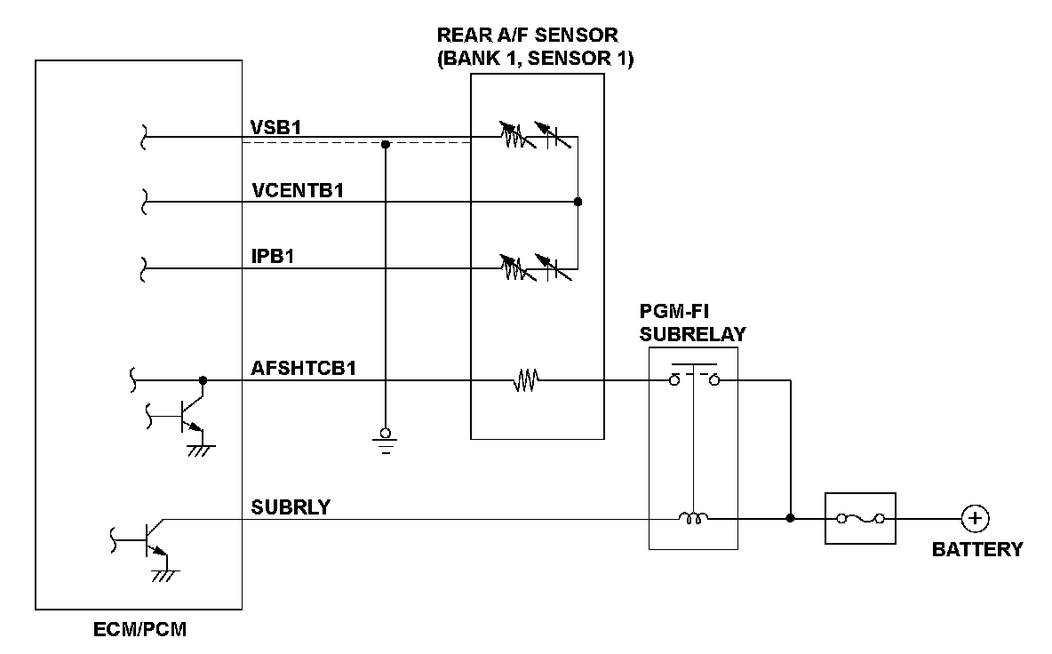 The rear air/fuel ratio (A/F) sensor (bank 1, sensor 1) is installed in the exhaust manifold and detects oxygen content in the exhaust gas. The rear A/F sensor transmits a signal to the engine control module (ECM)/powertrain control module (PCM). The ECM/PCM controls fuel injection duration by comparing the target air/fuel ratio with the rear A/F sensor signal. The sensor includes the VS cell, the pump cell, the atmospheric reference cavity, the diffusion layer, and the heater, and it enables overall feedback control. When the VSB1 terminal voltage and the ECM/PCM internal signal voltage are more than a specified value for more than a predetermined time, the ECM/PCM detects a malfunction and a DTC is stored.