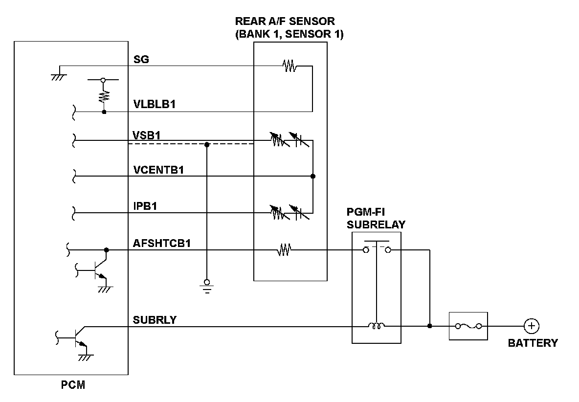 The rear air/fuel ratio (A/F) sensor (bank 1, sensor 1) is installed in the exhaust manifold and detects oxygen content in the exhaust gas. The rear A/F sensor transmits a signal to the powertrain control module (PCM). The PCM controls fuel injection duration by comparing the target air/fuel ratio with the rear A/F sensor signal. The sensor includes the VS cell, the pump cell, the atmospheric reference cavity, the diffusion layer, and the heater, and it enables overall feedback control. When the VSB1 terminal voltage and the PCM internal signal voltage are more than a specified value for more than a predetermined time, the PCM detects a malfunction and a DTC is stored.