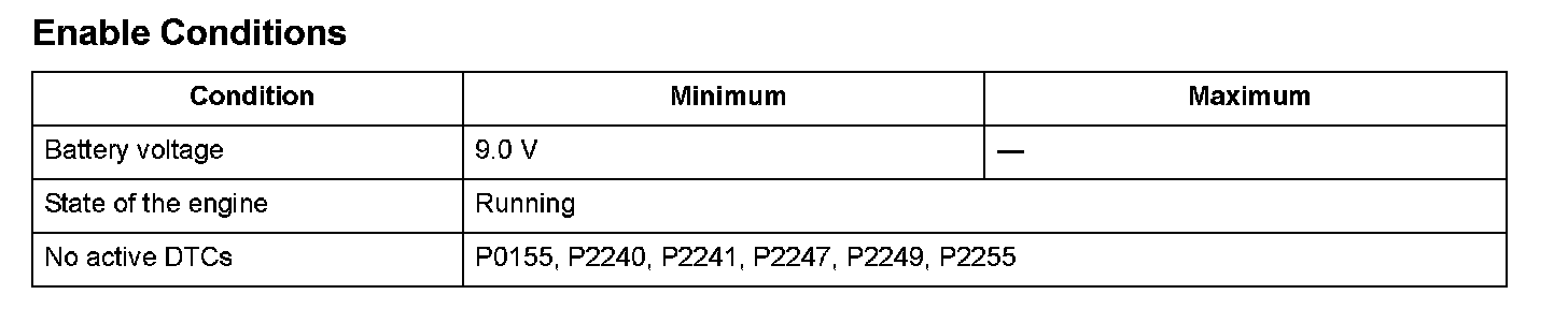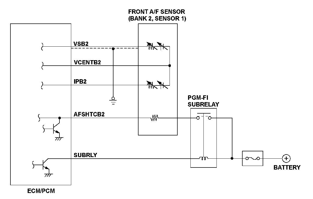 The front air/fuel ratio (A/F) sensor (bank 2, sensor 1) is installed in the exhaust manifold and detects oxygen content in the exhaust gas. The front A/F sensor transmits a signal to the engine control module (ECM)/powertrain control module (PCM). The ECM/PCM controls fuel injection duration by comparing the target air/fuel ratio with the front A/F sensor signal. The sensor includes the VS cell, the pump cell, the atmospheric reference cavity, the diffusion layer, and the heater, and it enables overall feedback control. When the VSB2 terminal voltage and the ECM/PCM internal signal voltage are more than a specified value for more than a predetermined time, the ECM/PCM detects a malfunction and a DTC is stored.