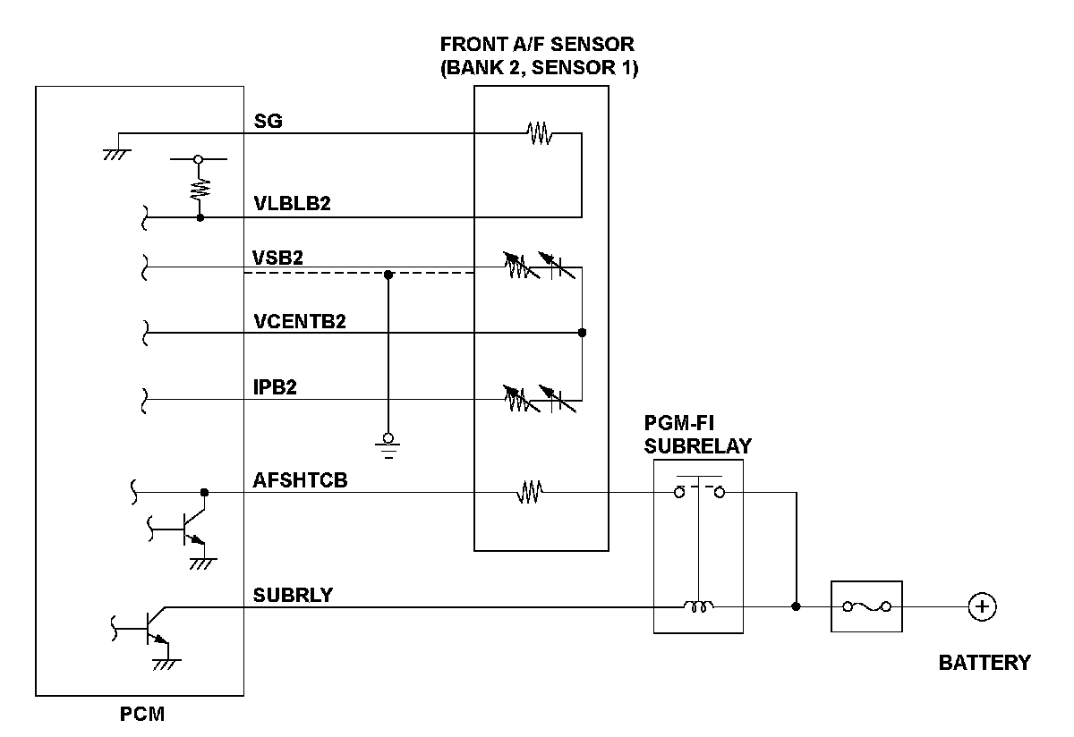 The front air/fuel ratio (A/F) sensor (bank 2, sensor 1) is installed in the exhaust manifold and detects oxygen content in the exhaust gas. The front A/F sensor transmits a signal to the powertrain control module (PCM). The PCM controls fuel injection duration by comparing the target air/fuel ratio with the front A/F sensor signal. The sensor includes the VS cell, the pump cell, the atmospheric reference cavity, the diffusion layer, and the heater, and it enables overall feedback control. When the VSB2 terminal voltage and the PCM internal signal voltage are more than a specified value for more than a predetermined time, the PCM detects a malfunction and a DTC is stored.