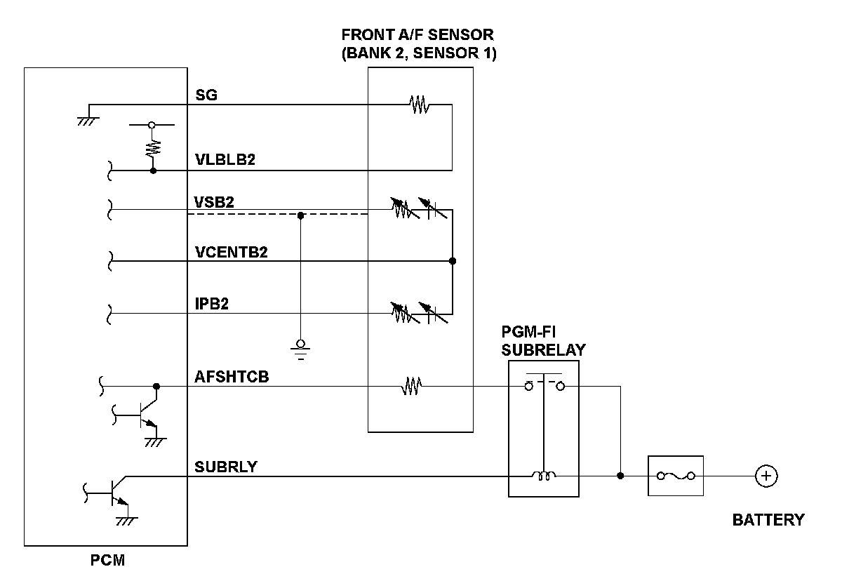 The front air/fuel ratio (A/F) sensor (bank 2, sensor 1) is installed in the exhaust manifold and detects oxygen content in the exhaust gas. The front A/F sensor transmits a signal to the powertrain control module (PCM). The PCM controls fuel injection duration by comparing the target air/fuel ratio with the front A/F sensor signal. The sensor includes the VS cell, the pump cell, the atmospheric reference cavity, the diffusion layer, and the heater, and it enables overall feedback control. When the self diagnosis function in the PCM detects a short failure, it measures the PCM input voltage of VSB2/VCENTB2/IPB2. If the VSB2 terminal voltage is less than VCENTB2/IPB2 terminal voltage, a malfunction is detected and stores a DTC.