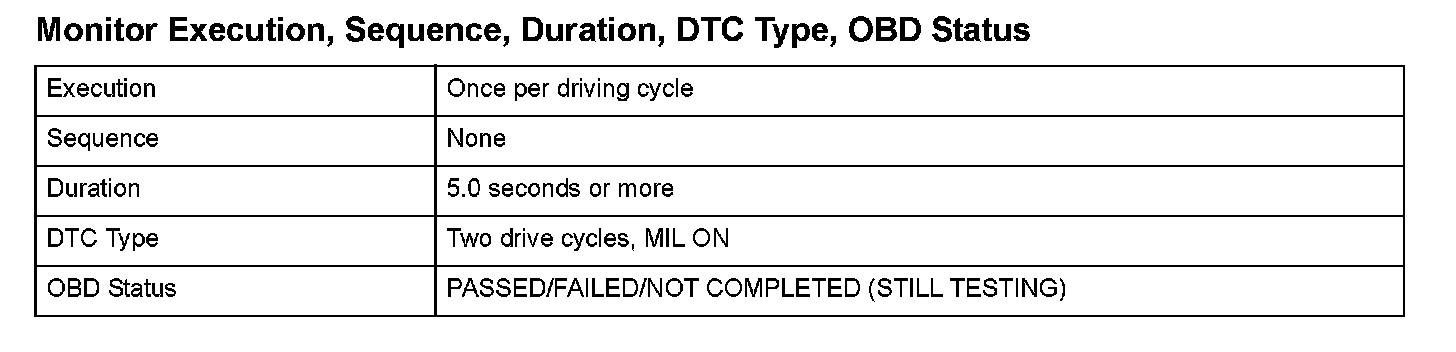 Monitor Execution, Sequence, Duration, DTC Type, OBD Status