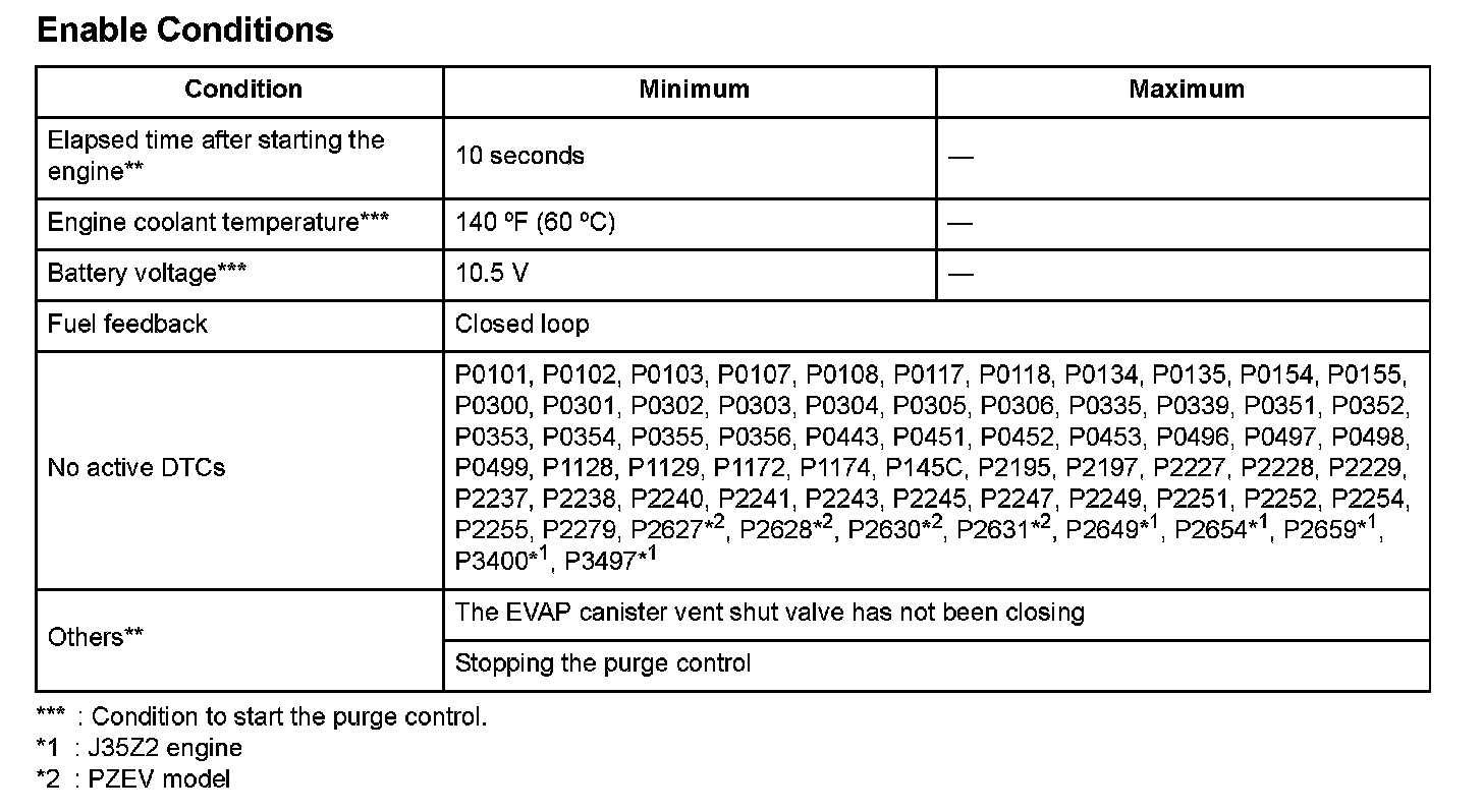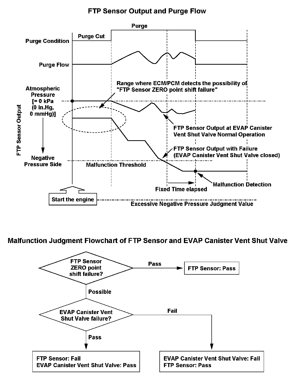 The fuel tank pressure (FTP) sensor output indicates about atmospheric pressure 0 kPa (0 in.Hg, 0 mmHg) before purge starts since the evaporative emission (EVAP) canister vent shut valve is normally open (open to the atmosphere). The sensor indicates a negative pressure value (vacuum) during purging. When the FTP sensor indicates vacuum after starting the engine, there is the possibility of an FTP sensor zero point shift failure or an EVAP canister vent shut valve stuck closed failure. So the engine control module (ECM)/powertrain control module (PCM) monitors the FTP sensor output after purge starts. The ECM/PCM detects a malfunction of the EVAP canister vent shut valve if the output indicates excessive vacuum. However, if the fuel tank internal pressure is below the specified value (excessive vacuum is detected) when starting the engine, the malfunction detection should be done as follows because it is difficult to distinguish the FTP sensor range problem (P1454) from the EVAP canister vent shut valve stuck closed (P2422).