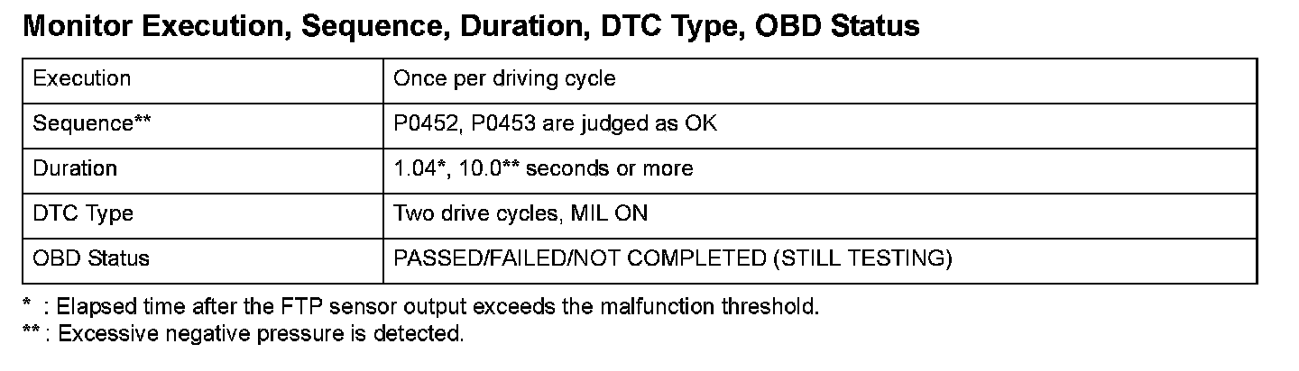 The output from the fuel tank pressure sensor is -3 kPa (-0.9 in.Hg, -25 mmHg)*, -1 kPa (-0.3 in.Hg, -10 mmHg)** or less for at least 1.04*, 10.0** seconds.