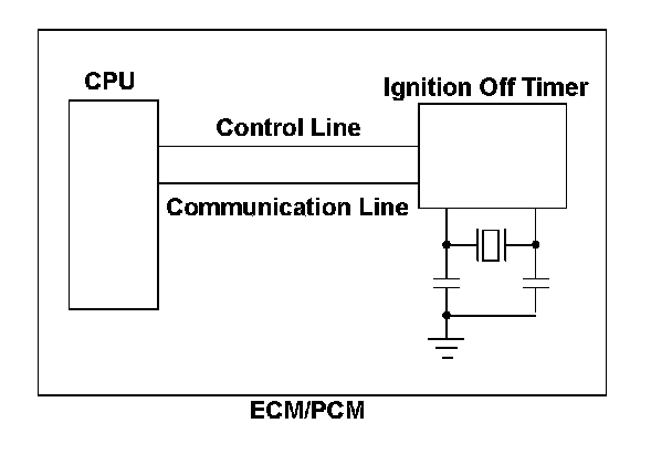 The engine control module (ECM)/powertrain control module (PCM) has a built-in ignition off timer that measures the duration of time from ignition off to the next ignition on. The measured duration is used for evaporative emission (EVAP) leak detection and temperature assumption of the catalytic converter. The CPU in the ECM/PCM accesses the ignition off timer when reading the measured duration. When the access process fails, a malfunction is detected and a DTC is stored. When an abnormality is found in the read data, a malfunction is detected and a DTC is stored.