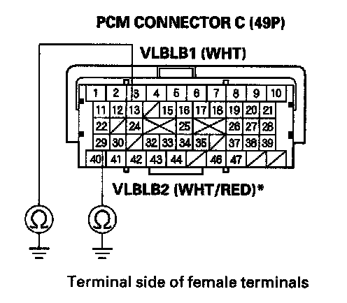 8. Check for continuity between PCM connector terminal C13 (C29)* and body ground.