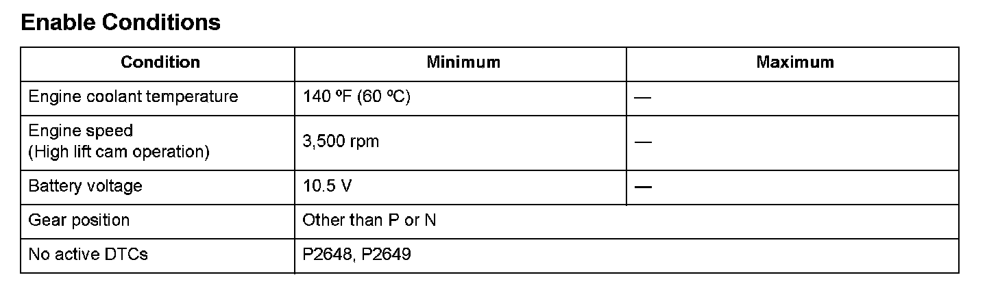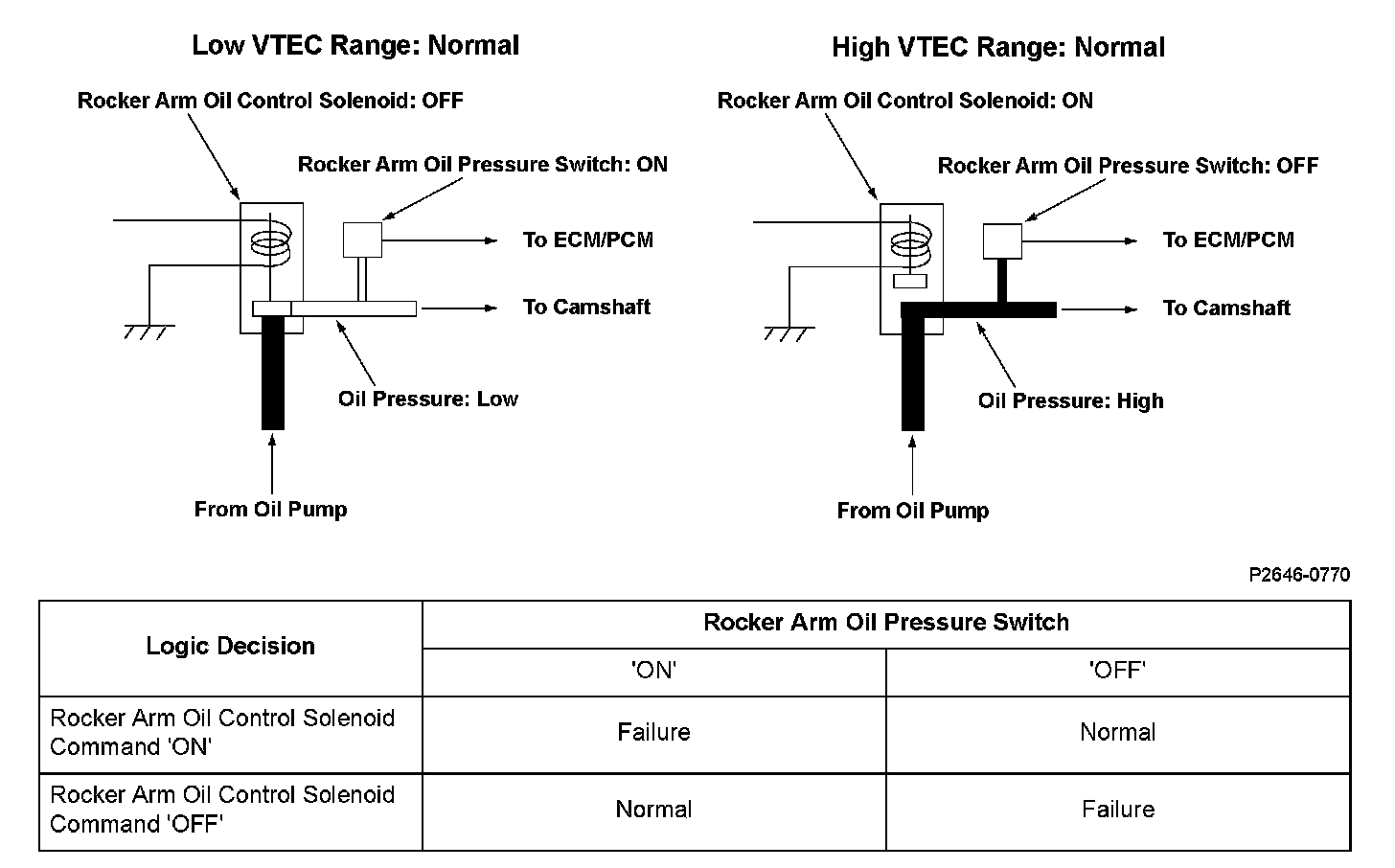 The VTEC system activates the rocker arm oil control solenoid by command from the engine control module (ECM)/power-train control module (PCM), and it charges/discharges the hydraulic circuit of the VTEC mechanism that switches valve timing between Low and High. The ECM/PCM monitors oil pressure in the hydraulic circuit of the VTEC mechanism using the rocker arm oil pressure switch downstream of the rocker arm oil control solenoid. If there is a difference between the oil pressure condition in the hydraulic circuit that is determined by the ECM/PCM command and the oil pressure condition that is determined by the status of the rocker arm oil pressure switch, the system is considered faulty, and a DTC is stored.