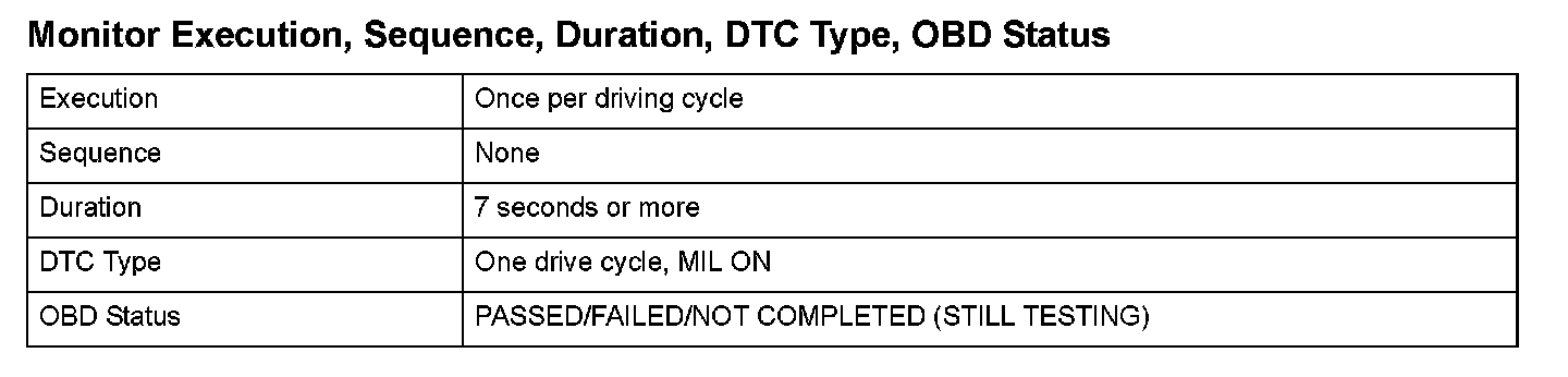 Monitor Execution, Sequence, Duration, DTC Type, OBD Status
