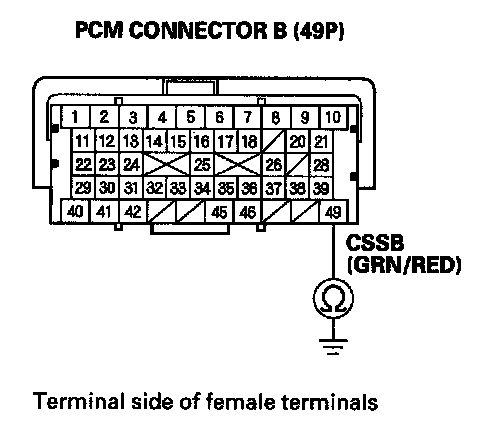 13. Check for continuity between PCM connector terminal B49 and body ground.