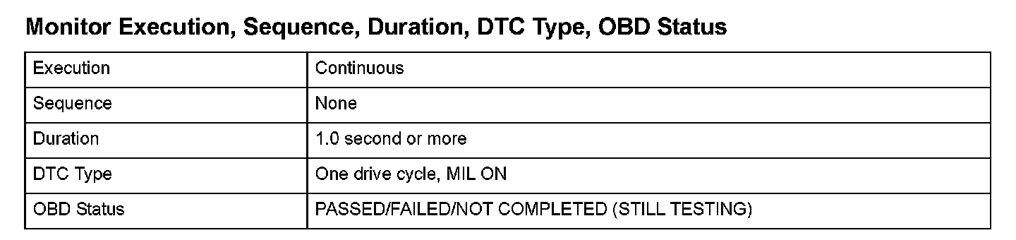 Monitor Execution, Sequence, Duration, DTC Type, OBD Status
