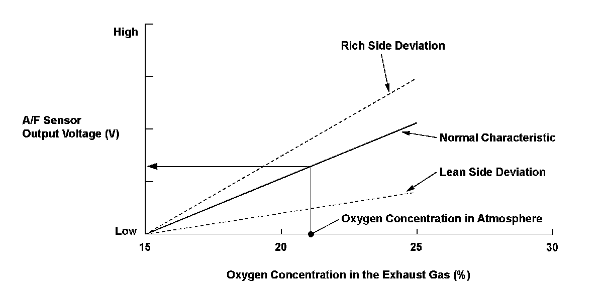 * Output to the scan tool exhibits a relationship between the front A/F sensor output and oxygen concentration, which is opposite to the characteristic shown in the graph. That is, a deviation toward the rich side increases the output voltage and one toward the lean side decreases the output voltage as the stoichiometric ratio is 0.