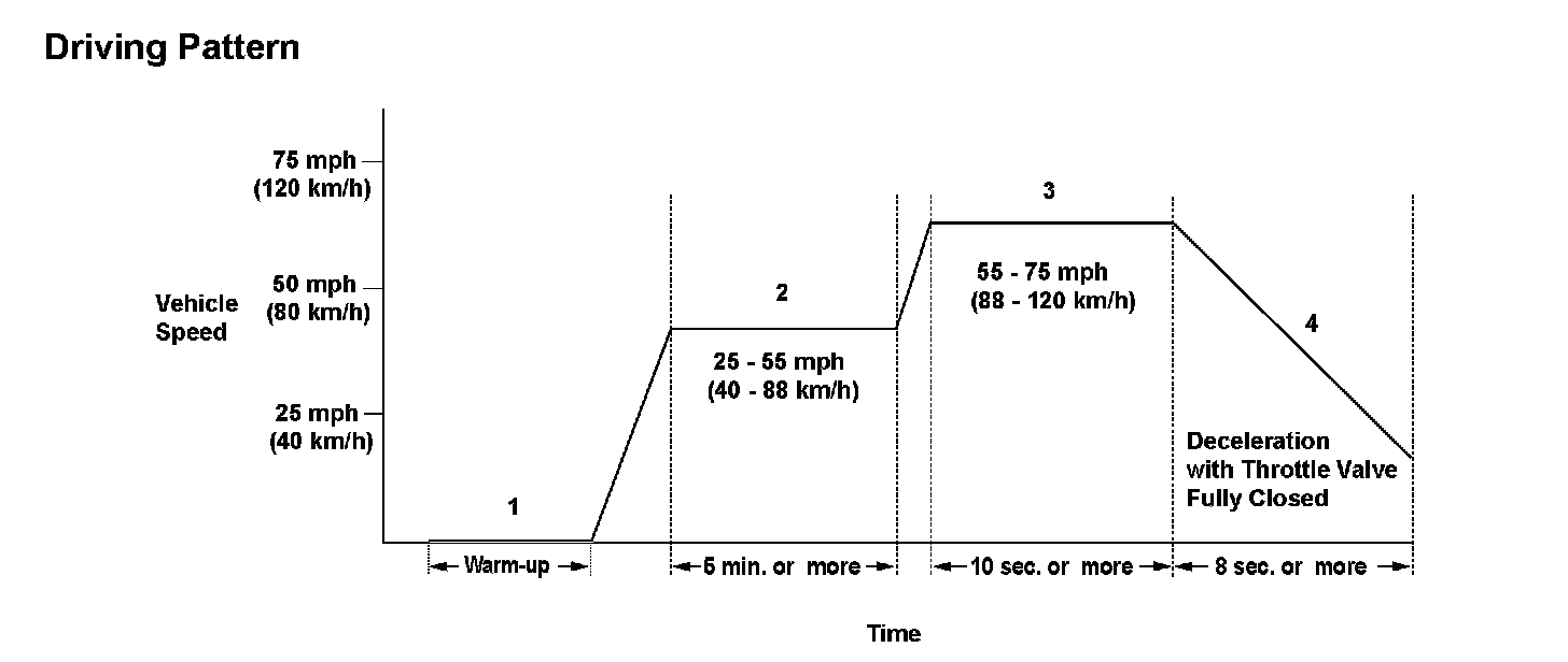 2. Drive the vehicle at a speed between 25 - 55 mph (40 - 88 km/h) for at least 5 minutes.