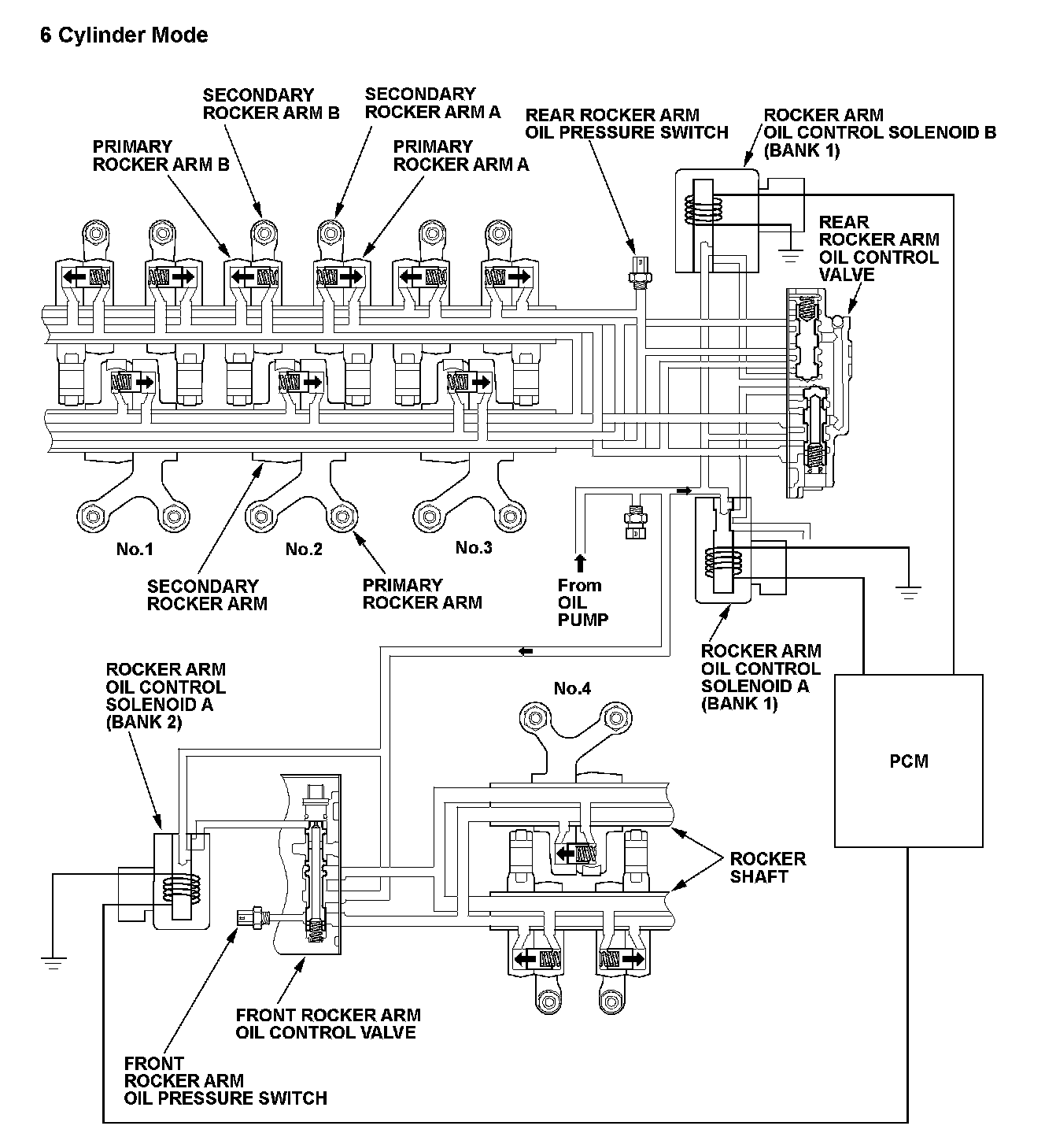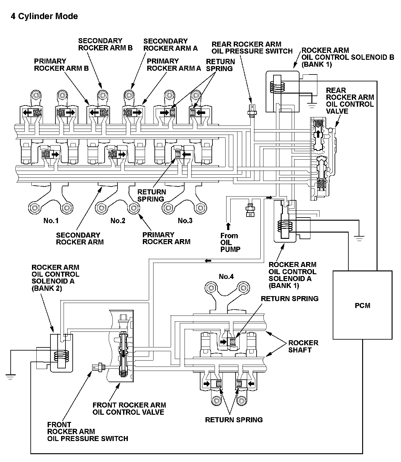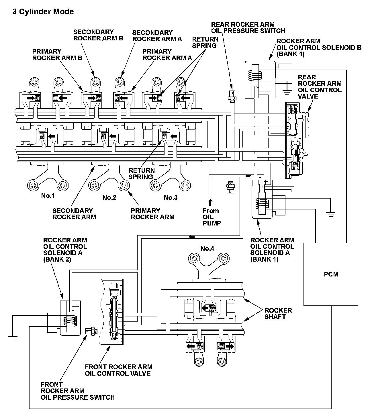 The variable cylinder management (VCM) system activates the rocker arm oil control solenoid A (bank 1), B (bank 1), and A (bank 2) by commands from the powertrain control module (PCM), and the appropriate solenoids charges/discharges the hydraulic circuit of the cylinder pause VTEC system that pauses the intake and exhaust valves on the front and rear banks. The PCM monitors oil pressure in the hydraulic circuit of the VTEC mechanism using the front or rear rocker arm oil pressure switches downstream of the rocker arm oil control solenoids. If there is a difference between the oil pressure conditions in the hydraulic circuit that are determined by the PCM command and the oil pressure conditions that are determined by the status of the front or rear rocker arm oil pressure switches, the system is considered faulty, and a DTC is stored. If uncommanded cylinders pausing (PCM tries the cylinders to operate but any cylinders are paused) failure is detected, the MIL is ON with one drive cycle, and If a cylinder does not pause (PCM tries the cylinders to pause but cylinders continue to operate) failure is detected, the MIL is ON in two drive cycles.