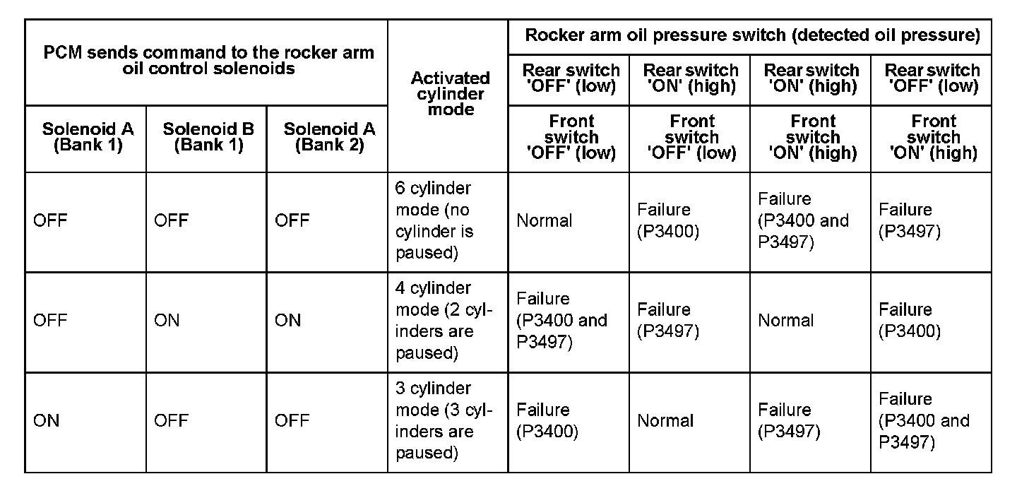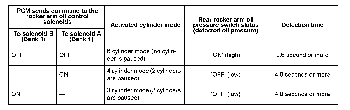 When the PCM sends ON (open) or OFF (close) command to rocker arm oil control solenoid A (bank 1) and B (bank 1), the rear rocker arm oil pressure switch detects each condition in the table.