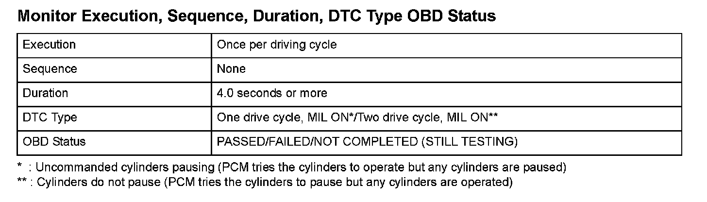 - Uncommanded pausing cylinders (PCM tries the cylinders to operate but any cylinders are paused): When a malfunction is detected, the MIL comes on and the DTC and the freeze frame data are stored in the PCM memory.