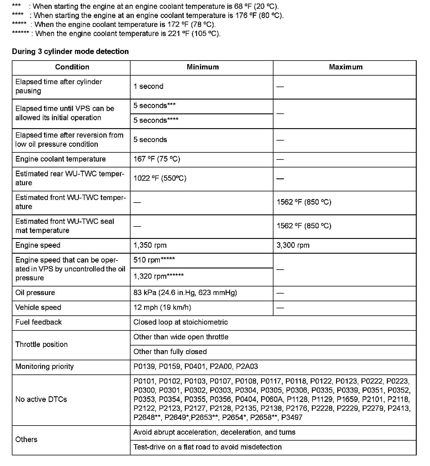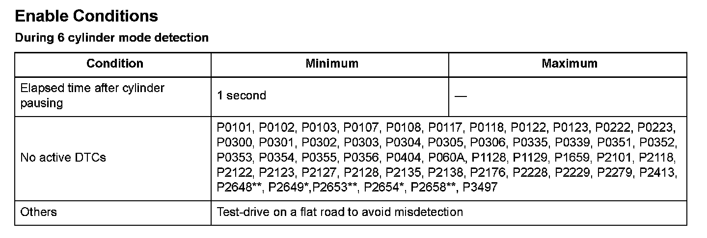 - Cylinders do not pause (PCM tries the cylinders to pause but any cylinders are operated): When a malfunction is detected during the first drive cycle, a Temporary DTC is stored in the PCM memory. If the malfunction recurs during the next (second) drive cycle, the MIL comes on and the DTC and the freeze frame data are stored.