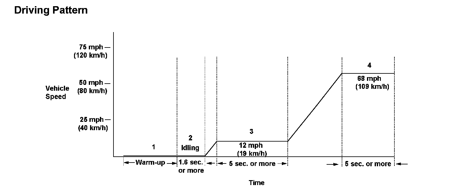 3. Drive the vehicle at a steady speed of 12 mph (19 km/h) or more at a steady engine speed between 1,350 - 3,300 rpm for at least 5 seconds.