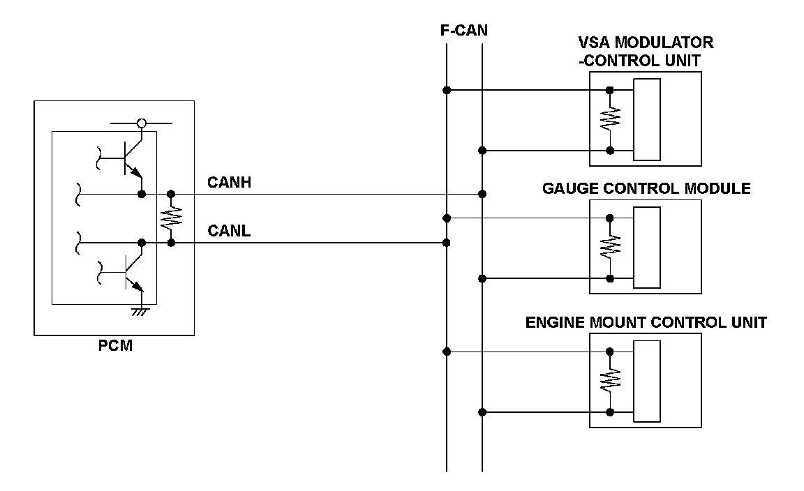 The controller area network (CAN) transmits/receives pulsing signals to/from the control modules simultaneously by using two signal lines (CANH and CANL). When the information is not sent from the powertrain control module (PCM) through the F-CAN and this condition continues for a specified time or when the information sent from the PCM is abnormal and this condition continues for a specified cycle, a DTC is stored.