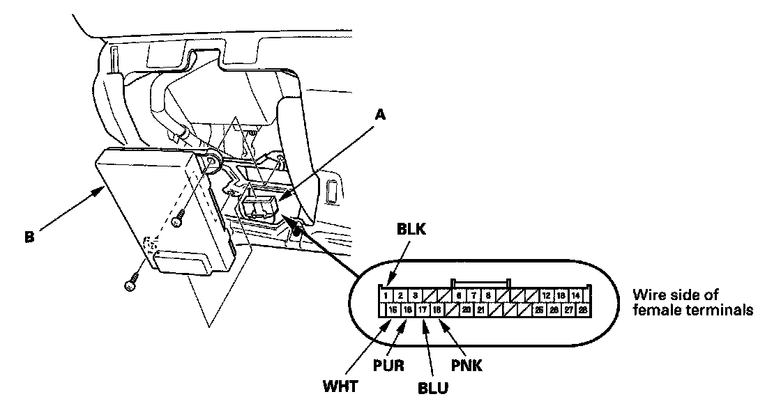 2. Remove the HFL control unit screws, then disconnect the 28P connector (A) from the HandsFreeLink control unit (B).