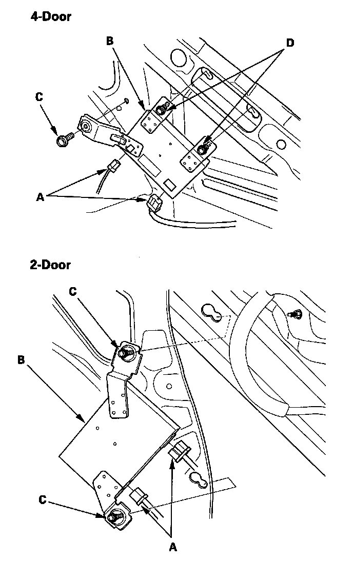 3. Remove the mounting bolt (C) and loosen the mounting bolts (D), then remove the XM receiver.