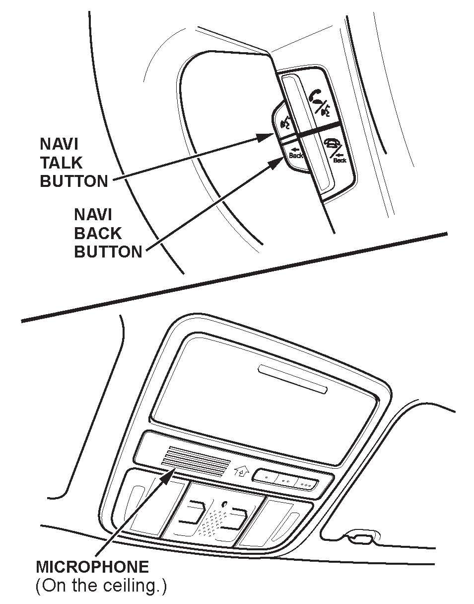 NAVI TALK button - Pull and release this button on the steering wheel to activate the voice control system. After pulling and releasing the button, wait for the beep, then speak the command.