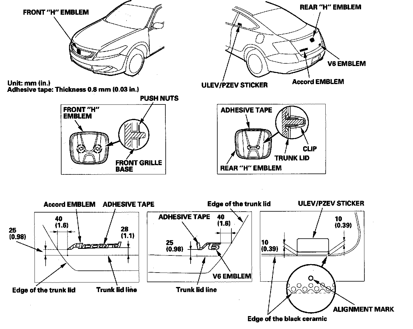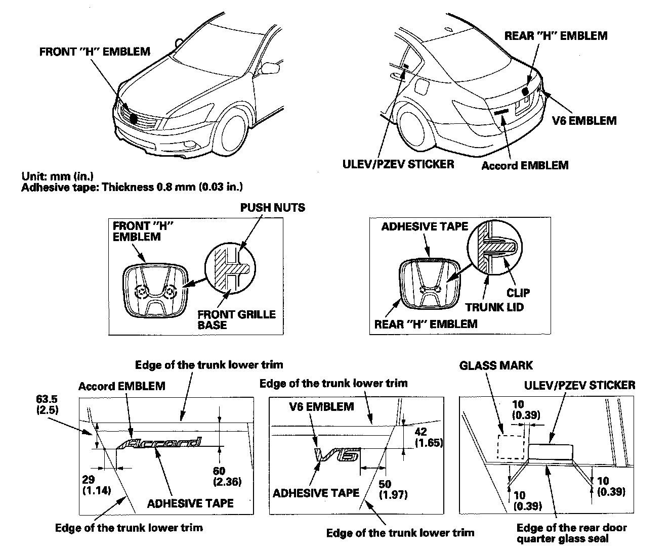 3. Apply the emblems/sticker where shown. When installing the ULEV/PZEV sticker on the inside surface of the left rear door quarter glass, align the sticker with the edge of the glass mark and the rear door quarter glass seal as shown, then press the sticker into place, and remove the application tape.