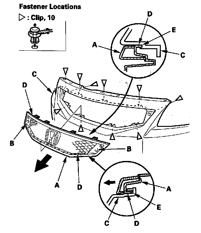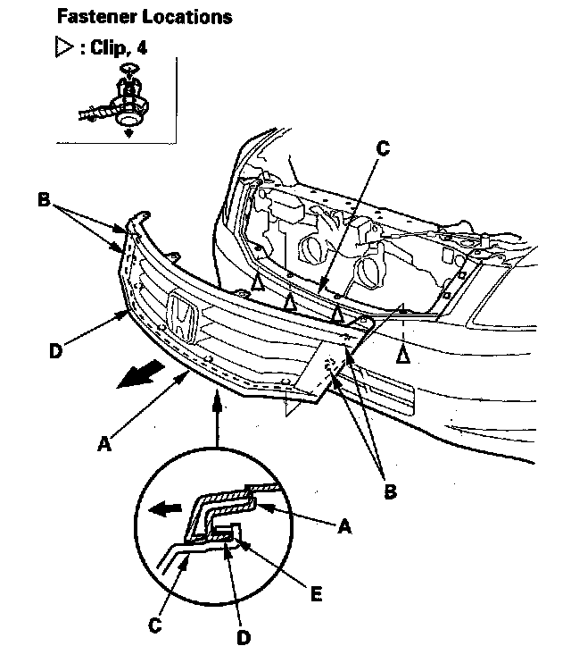2. Detach both hooks (B) of the grille from the front bumper (C), and release the ribs (D) of the grille from the groove (E) of the bumper by pulling the grille out.